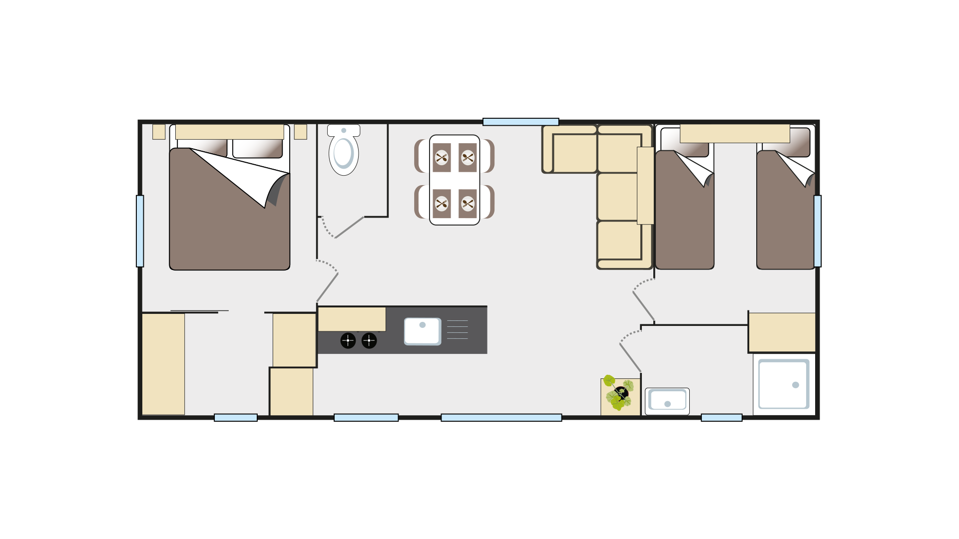 Ce mobil-home 2 chambres de conception résolument moderne vous propose un large espace pour vous garantir un excellent séjour en famille. Il comprend une chambre parentale avec un lit double (160 x 200 cm) et un dressing, une chambre avec 2 lits simples (80 x 190 cm), une salle de séjour avec cuisine américaine équipée, une salle d'eau avec douche lavabo et WC séparé.